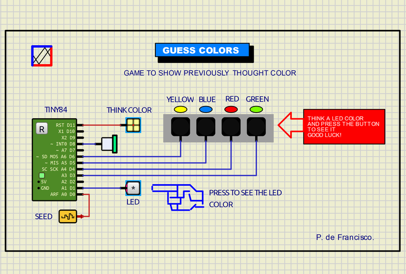 When starting the program the “THINK COLOR” LED flashes, think of one of the four colors. Then press the button, the randomly generated LED number lights up for a few seconds and a small warning beep sounds. The player will determine if he was correct or not.
