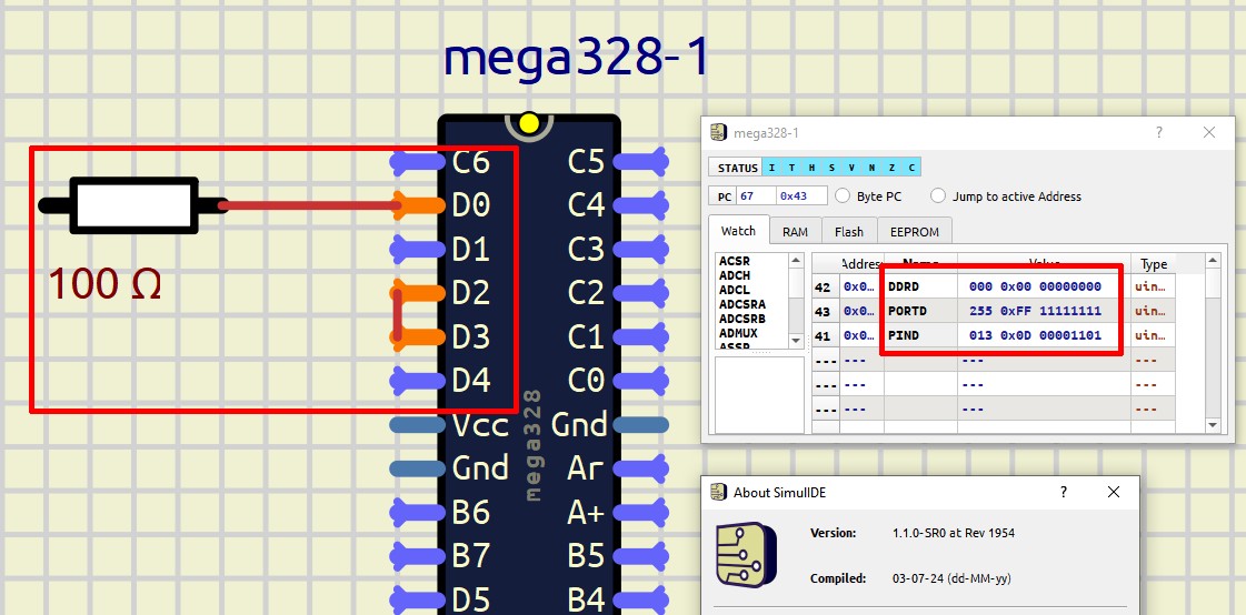 int main(void) { DDRD = 0x00; PORTD = 0xFF; while (1) {} }The expected result shall be, that all pins have the input "1".