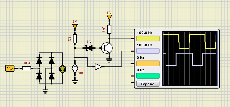 Would you please replace the manual voltage source with a 100 Hz triangular signal to flip an LED at every edge detection?