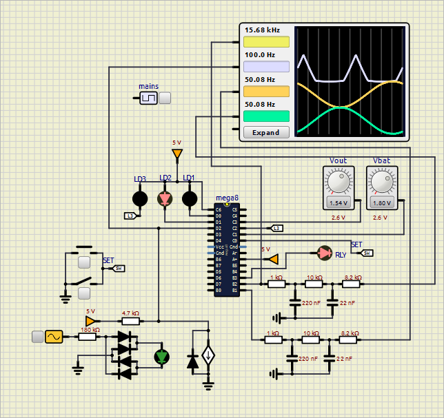 After running the code, LED2 will start blinking (turning on and off) to signal the presence of the mains voltage. Then, after a while, the MCU stops generating the two sine waves.