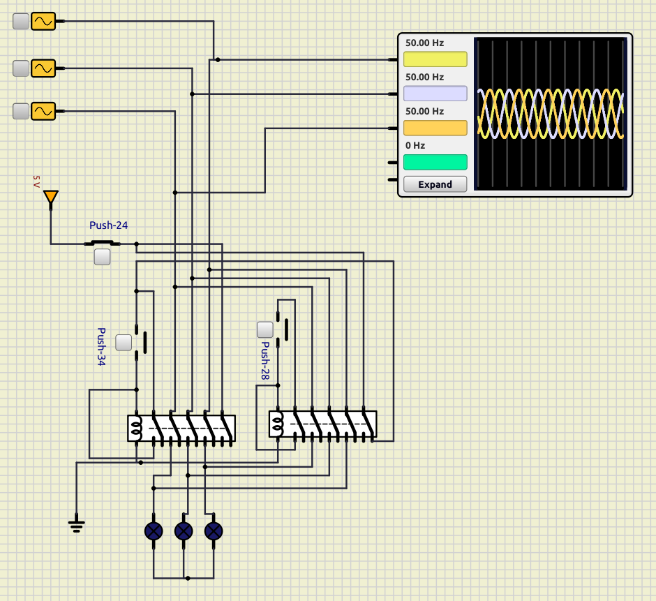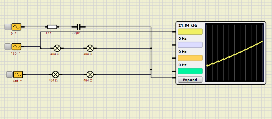 <item itemtype="WaveGen" CircId="WaveGen-2" mainComp="false" ShowProp="Phase" Show_id="false" Show_Val="true" Pos="-492,-312" rotation="0" hflip="1" vflip="1" label="WaveGen-2" idLabPos="-64,-24" labelrot="0" valLabPos="-16,8" valLabRot="0" Out="true" Running="true" Wave_Type="Sine" Freq="50 Hz" Phase="120 _º" Steps="1000 _Steps" Duty="50 _%" Always_On="false" Bipolar="false" Floating="false" Semi_Ampli="311 V" Mid_Volt="0 V" /> <item itemtype="Oscope" CircId="Oscope-11" mainComp="false" Show_id="false" Show_Val="false" Pos="-32,-324" rotation="0" hflip="1" vflip="1" label="Oscope-11" idLabPos="-90,-100" labelrot="0" valLabPos="-16,20" valLabRot="0" Basic_X="135 _px" Basic_Y="135 _px" BufferSize="600000" connectGnd="true" InputImped="10 MΩ" TimDiv="4451907722" TimPos="-92619898223,-92619898223,-92619898223,-92619898223," VolDiv="100,100,100,100," Tunnels=",,,," Trigger="0" Filter="0.1 V" Trigger="0" AutoSC="4" Tracks="1" HideCh="false,false,false,false," VolPos="0,0,0,0," /> <item itemtype="Lamp" CircId="Lamp-8" mainComp="false" ShowProp="Resistance" Show_id="false" Show_Val="true" Pos="-316,-244" rotation="0" hflip="1" vflip="1" label="Lamp-8" idLabPos="-16,-24" labelrot="0" valLabPos="-16,6" valLabRot="0" Resistance="484 Ω" MaxCurrent="0.318 A" /> <item itemtype="Lamp" CircId="Lamp-6" mainComp="false" ShowProp="Resistance" Show_id="false" Show_Val="true" Pos="-396,-308" rotation="0" hflip="1" vflip="1" label="Lamp-6" idLabPos="-16,-24" labelrot="0" valLabPos="-16,6" valLabRot="0" Resistance="484 Ω" MaxCurrent="0.318 A" /> <item itemtype="Node" CircId="Node-15" mainComp="false" Pos="-168,-256" /> <item itemtype="WaveGen" CircId="WaveGen-3" mainComp="false" ShowProp="Phase" Show_id="false" Show_Val="true" Pos="-488,-244" rotation="0" hflip="1" vflip="1" label="WaveGen-3" idLabPos="-64,-24" labelrot="0" valLabPos="-16,8" valLabRot="0" Out="true" Running="true" Wave_Type="Sine" Freq="50 Hz" Phase="240 _º" Steps="1000 _Steps" Duty="50 _%" Always_On="false" Bipolar="false" Floating="false" Semi_Ampli="311 V" Mid_Volt="0 V" /> <item itemtype="Lamp" CircId="Lamp-7" mainComp="false" ShowProp="Resistance" Show_id="false" Show_Val="true" Pos="-316,-308" rotation="0" hflip="1" vflip="1" label="Lamp-7" idLabPos="-16,-24" labelrot="0" valLabPos="-16,6" valLabRot="0" Resistance="484 Ω" MaxCurrent="0.318 A" /> <item itemtype="Node" CircId="Node-14" mainComp="false" Pos="-428,-244" /> <item itemtype="Node" CircId="Node-12" mainComp="false" Pos="-168,-308" /> <item itemtype="Capacitor" CircId="Capacitor-10" mainComp="false" ShowProp="Capacitance" Show_id="false" Show_Val="true" Pos="-344,-360" rotation="0" hflip="1" vflip="1" label="Capacitor-10" idLabPos="-16,-24" labelrot="0" valLabPos="-16,6" valLabRot="0" Capacitance="0.5 µF" Resistance="1 µΩ" InitVolt="0 V" ReaStep="0 ns" /> <item itemtype="Node" CircId="Node-13" mainComp="false" Pos="-436,-308" /> <item itemtype="WaveGen" CircId="WaveGen-1" mainComp="false" ShowProp="Phase" Show_id="false" Show_Val="true" Pos="-492,-360" rotation="0" hflip="1" vflip="1" label="WaveGen-1" idLabPos="-64,-24" labelrot="0" valLabPos="-16,8" valLabRot="0" Out="true" Running="true" Wave_Type="Sine" Freq="50 Hz" Phase="0 _º" Steps="1000 _Steps" Duty="50 _%" Always_On="false" Bipolar="false" Floating="false" Semi_Ampli="311 V" Mid_Volt="0 V" /> <item itemtype="Lamp" CircId="Lamp-9" mainComp="false" ShowProp="Resistance" Show_id="false" Show_Val="true" Pos="-400,-244" rotation="0" hflip="1" vflip="1" label="Lamp-9" idLabPos="-16,-24" labelrot="0" valLabPos="-16,6" valLabRot="0" Resistance="484 Ω" MaxCurrent="0.318 A" /> <item itemtype="Connector" uid="Connector-11" startpinid="WaveGen-2-outnod" endpinid="Node-13-0" pointList="-476,-312,-436,-312,-436,-308" /> <item itemtype="Connector" uid="Connector-17" startpinid="Node-12-2" endpinid="Node-15-0" pointList="-168,-308,-168,-256" /> <item itemtype="Connector" uid="Connector-10" startpinid="Oscope-11-Pin0" endpinid="Node-13-1" pointList="-120,-372,-436,-372,-436,-308" /> <item itemtype="Connector" uid="Connector-6" startpinid="Lamp-6-rPin" endpinid="Lamp-7-lPin" pointList="-380,-308,-332,-308" /> <item itemtype="Connector" uid="Connector-7" startpinid="Lamp-7-rPin" endpinid="Node-12-1" pointList="-300,-308,-168,-308" /> <item itemtype="Connector" uid="Connector-18" startpinid="Node-15-2" endpinid="Lamp-8-rPin" pointList="-168,-256,-168,-244,-300,-244" /> <item itemtype="Connector" uid="Connector-13" startpinid="Oscope-11-Pin1" endpinid="Node-14-1" pointList="-120,-340,-428,-340,-428,-244" /> <item itemtype="Connector" uid="Connector-15" startpinid="Node-14-2" endpinid="Lamp-9-lPin" pointList="-428,-244,-416,-244" /> <item itemtype="Connector" uid="Connector-12" startpinid="Node-13-2" endpinid="Lamp-6-lPin" pointList="-436,-308,-412,-308" /> <item itemtype="Connector" uid="Connector-16" startpinid="Oscope-11-PinG" endpinid="Node-15-1" pointList="-120,-260,-120,-256,-168,-256" /> <item itemtype="Connector" uid="Connector-14" startpinid="WaveGen-3-outnod" endpinid="Node-14-0" pointList="-472,-244,-428,-244" /> <item itemtype="Connector" uid="Connector-3" startpinid="Lamp-9-rPin" endpinid="Lamp-8-lPin" pointList="-384,-244,-332,-244" /> <item itemtype="Connector" uid="Connector-8" startpinid="Capacitor-10-rPin" endpinid="Node-12-0" pointList="-328,-360,-168,-360,-168,-308" /> <item itemtype="Connector" uid="Connector-1" startpinid="WaveGen-1-outnod" endpinid="Capacitor-10-lPin" pointList="-476,-360,-360,-360" />