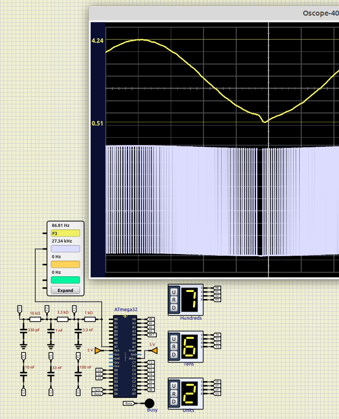Thanks to simulIDE, it was possible for me to fix many bugs in my rather complex code. In my experimental circuit I used 3-RC LPF. And to input the frequency index (0 to 969), I used 3 encoded BCD 10-state thumbwheels. The scope displays the sinewaves of the low band (index 485 up to 969) though, for a few of them, with a small distortion. Such distortion doesn’t exist in real. I mean that the scope of simulIDE is ok for the low band only because the delta bit rate is 62,500 Hz, not 2,000,000 Hz (of the high band).