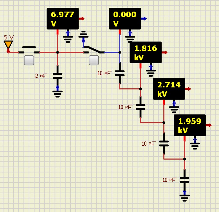 At the slowest speed, the voltage first increases in the last three capacitors, and then it affects all of them) And this build-up does not occur immediately, but probably during the drift)