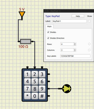 void KeyPad_with_Diodes::stamp() { for( int row=0; row<m_rows; row++ ) { Pin* rowPin = m_pin[row]; for( int col=0; col<m_cols; col++ ) { Pin* colPin = m_pin[m_rows+col]; eDiode* diode = m_diodes.at( row*m_cols+col ); diode->setEpin( 0, rowPin ); diode->setEpin(1,colPin); } } }now trying to connect the rowpin -> diode -> button -> colpin:
