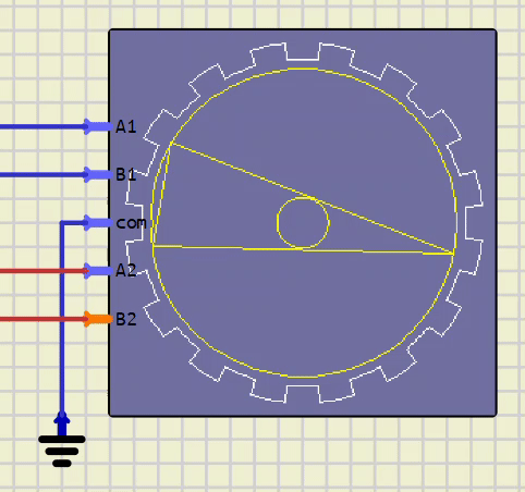 For the moment, the motor only works in unipolar mode.The input signals A+, A-, B+, B- are filtered to obtain DC voltages (they therefore accept PWM signals). Depending on the values of the input signals, the rotor movement is simulated using the fundamental relationship of dynamics, although the magnetic forces are very roughly approximated.