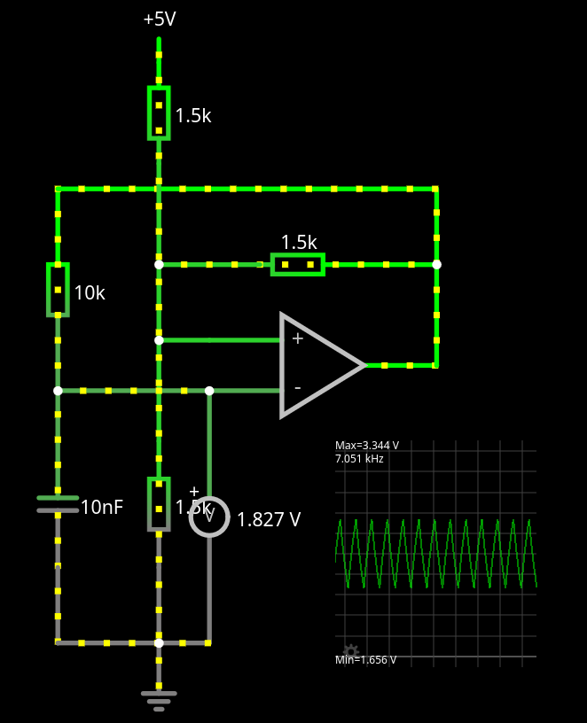 "10nF" cap, oscillates about 435Hz