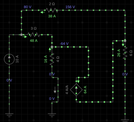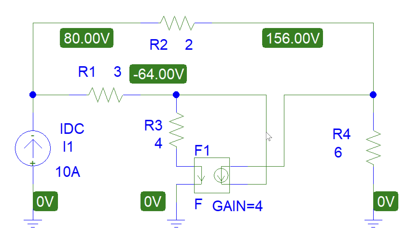 The current-controlled current source has a bug. The expected voltages are VA = 80 V, VB = −64 V, and VC = 156 V. This is not at all what the voltage probes are displaying.