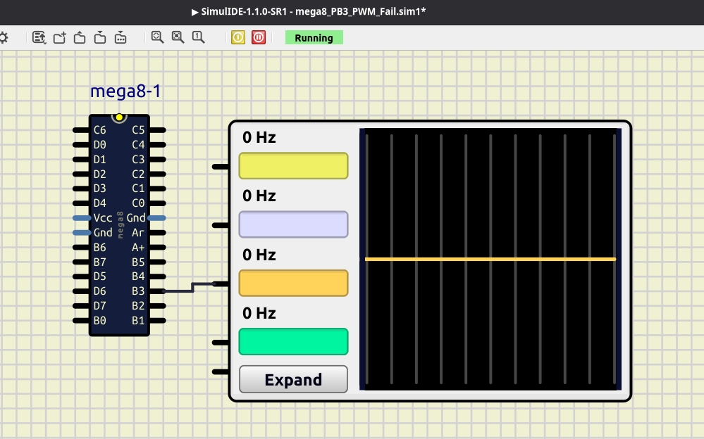Good day, so bear metal MCU (AtMega8-16PU) outputs PWM on a PB3 pin just fine but i cant get simulator to do this.