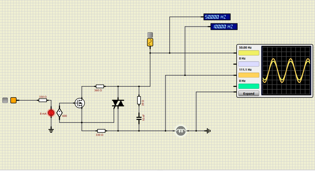 Quote from feri on January 21, 2026, 7:07 pmI tried the schematic of a solid state relay but the frequency of the wave across the lamp becomes 100Hz in Simulide 1.01 and 200Hz in simulide 2.0, while the waves in the oscilloscope appear to have the same frequency.