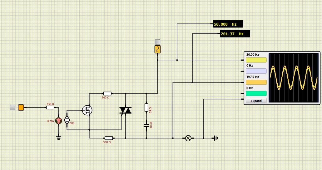 I tried the schematic of a solid state relay but the frequency of the wave across the lamp becomes 100Hz in Simulide 1.01 and 200Hz in simulide 2.0, while the waves in the oscilloscope appear to have the same frequency.