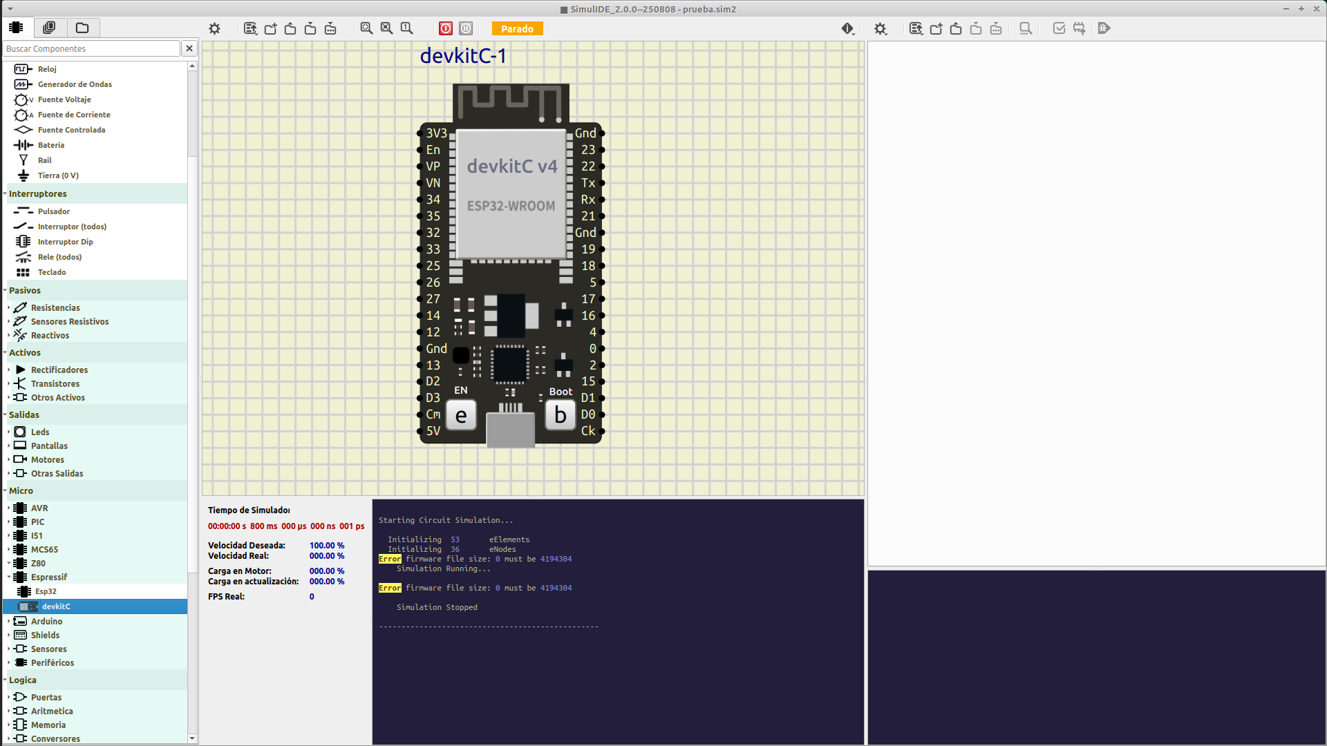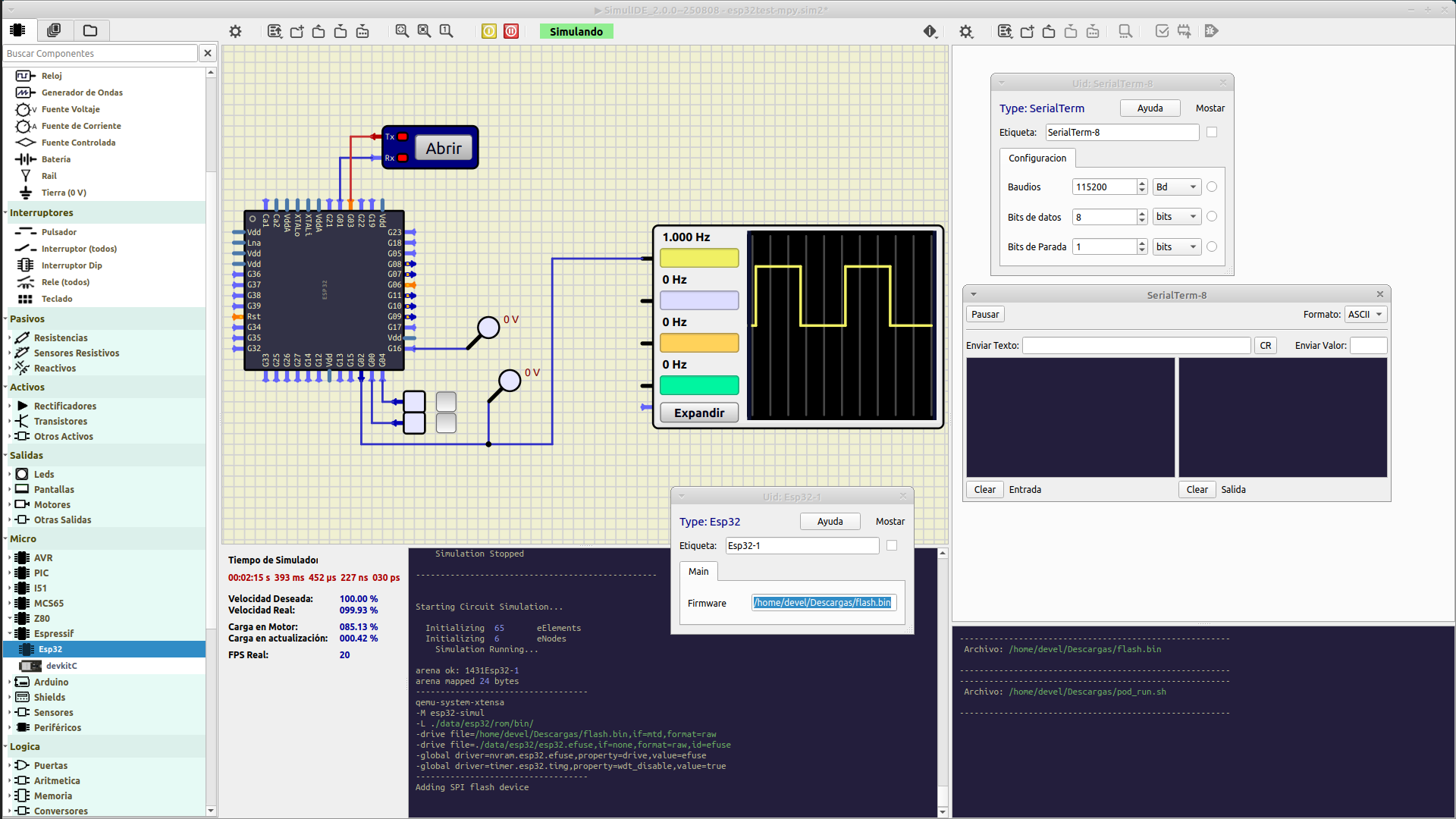 The QEMU serial console would need to be redirected to SimulIDE in order to interact with MicroPython.I also tried doing the same with the "devkitC", but I cannot find where to configure the firmware file that should be loaded: