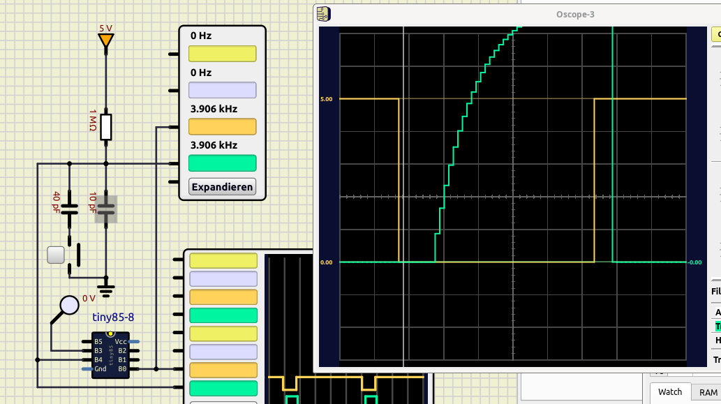 Quote from steinm on January 19, 2024, 3:43 pmNot sure if this is a bug, but the behaviour is somehow odd. The circuit basically charges a capacitor of 10pf over 1MOhm and after a while it discharges it by pulling it 0V. During charging the PB4 is an input pin and once the voltage has reached a level high enough to detect a high level at PB4 the Attiny85 will do some internal calculation and set PB4 to an output pin and pulls it to low.
