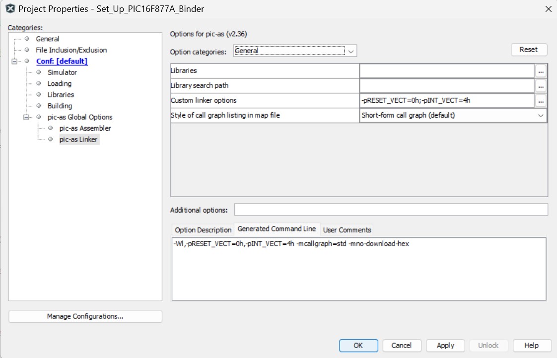 The project has these pic-as Linker Options: